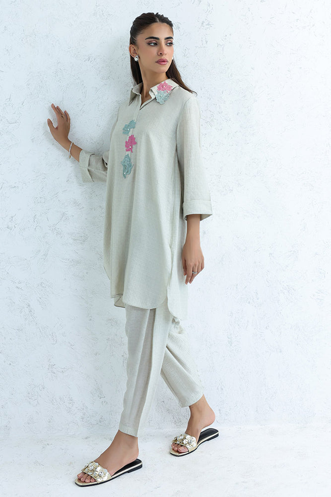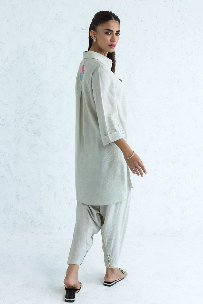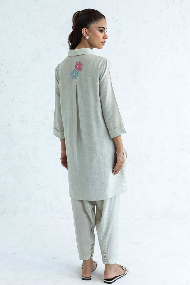 – Lace flower embellishments on the front patti, one collar side, and back box pleat