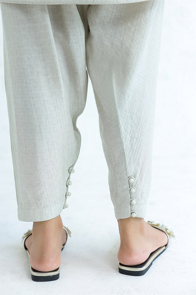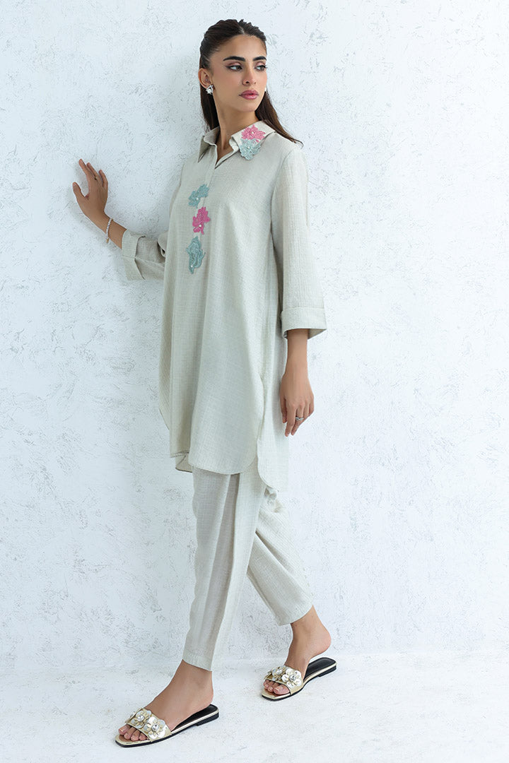 – Three-quarter sleeves with folded cuffs for a structured finish