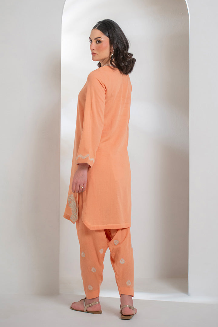 Design Detail: A regular fit shirt with embellished neckline. Embroidered paisleys on the hem edges with straight full length sleeves. Paired with embroidered smart shalwar.