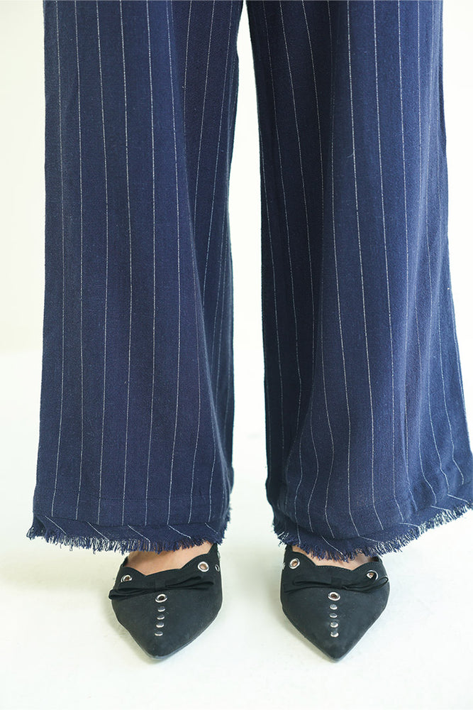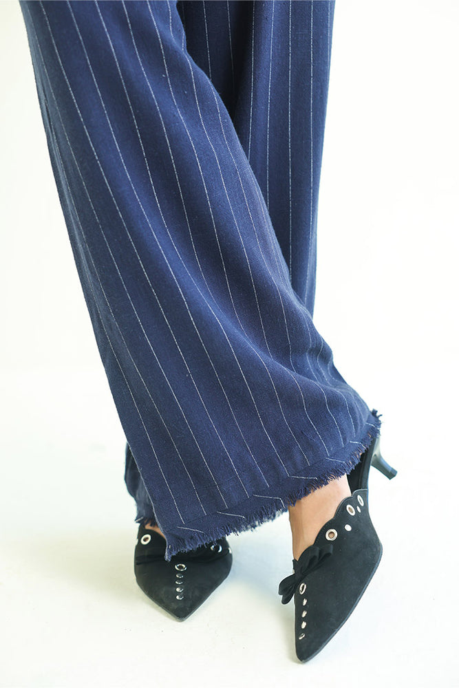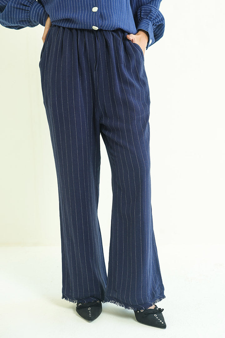 - Design Detail: A straight loose fit pant. Comfortable elastic waist band and front pockets. Fringe detail added to the hem of the pant.