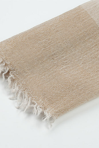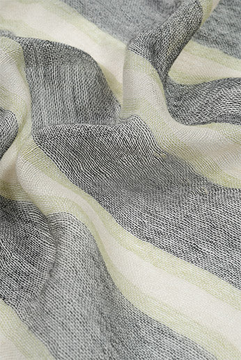 A woven scarf with horizontal stripes in contrasting muted colours.