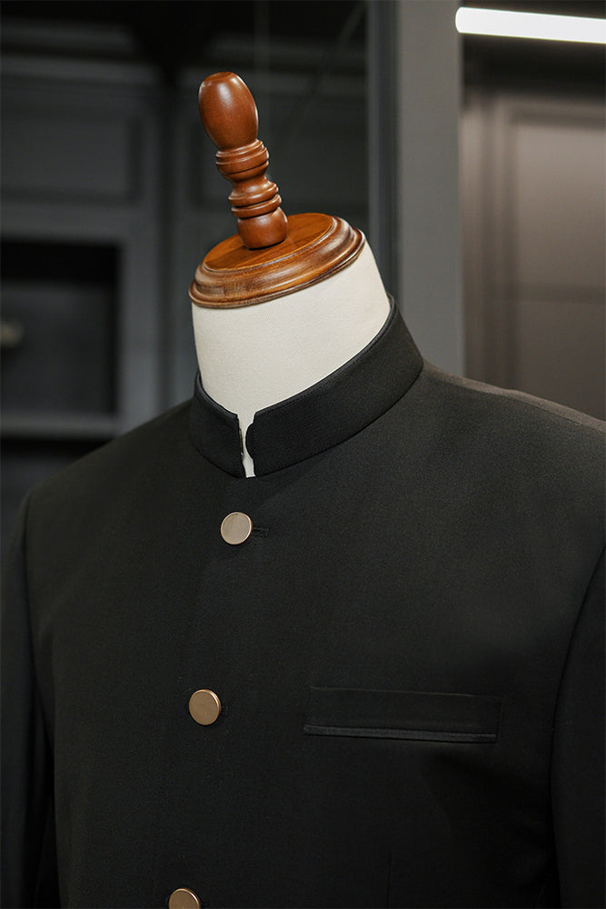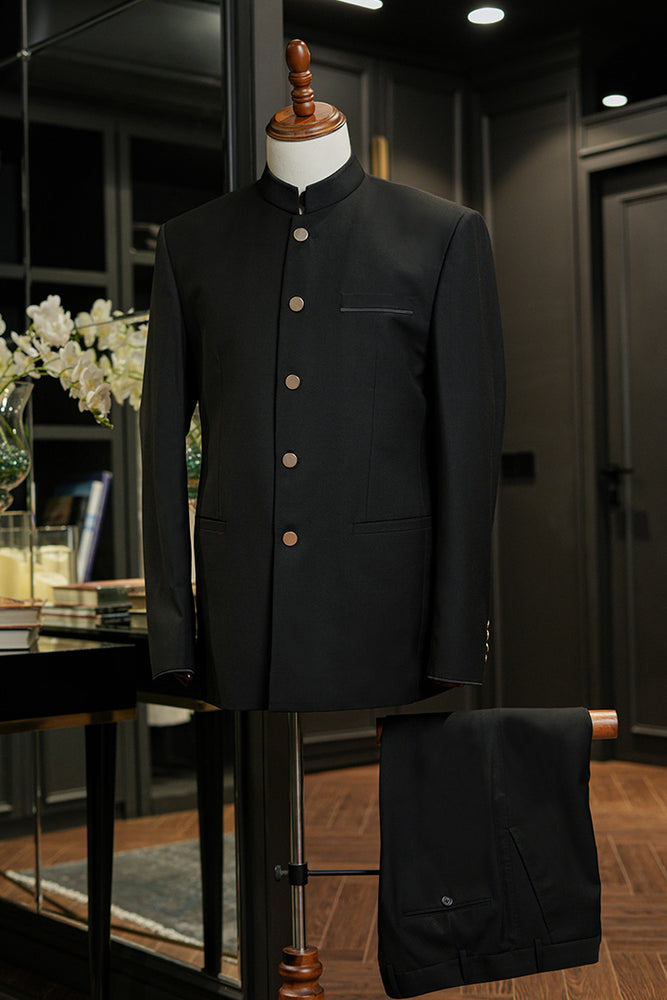 2-Piece Prince suit with a sleek band collar, featuring a welt pocket detailed with black satin piping. Paired with matching tailored pants for a complete look.