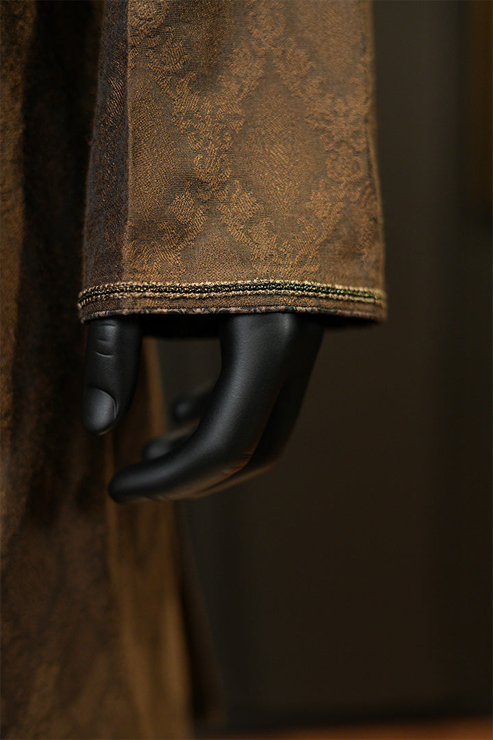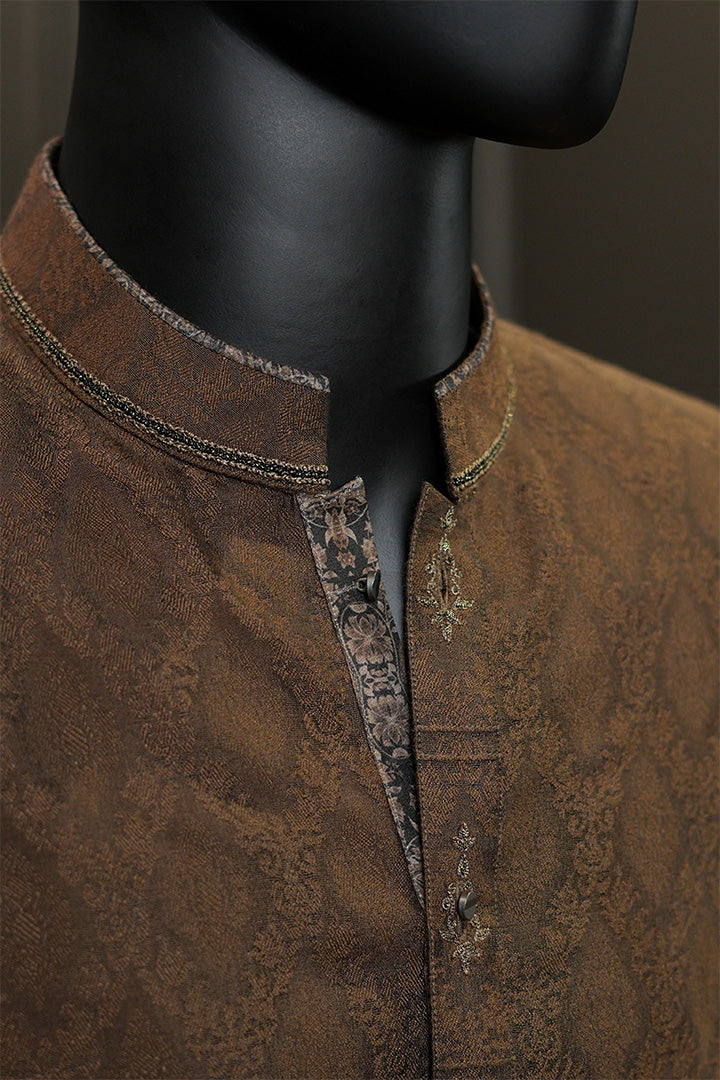 Jacquard jamawar kurta featuring an embroidered band collar and sleeves, with aari work on the front placket for a refined look.