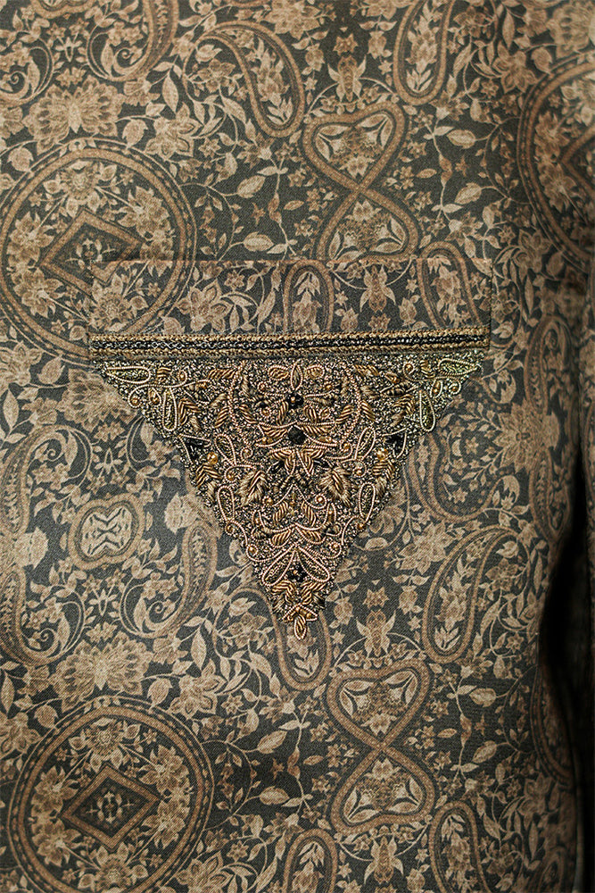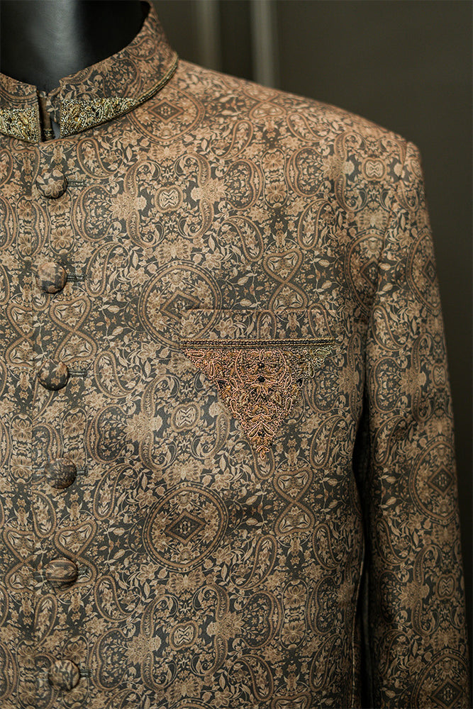 Sherwani with hand-embroidered detailing on the collar, front, and welt pockets, perfectly paired with matching khussa.