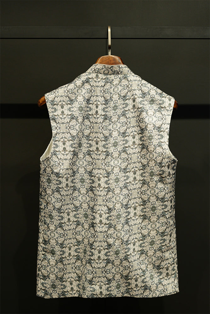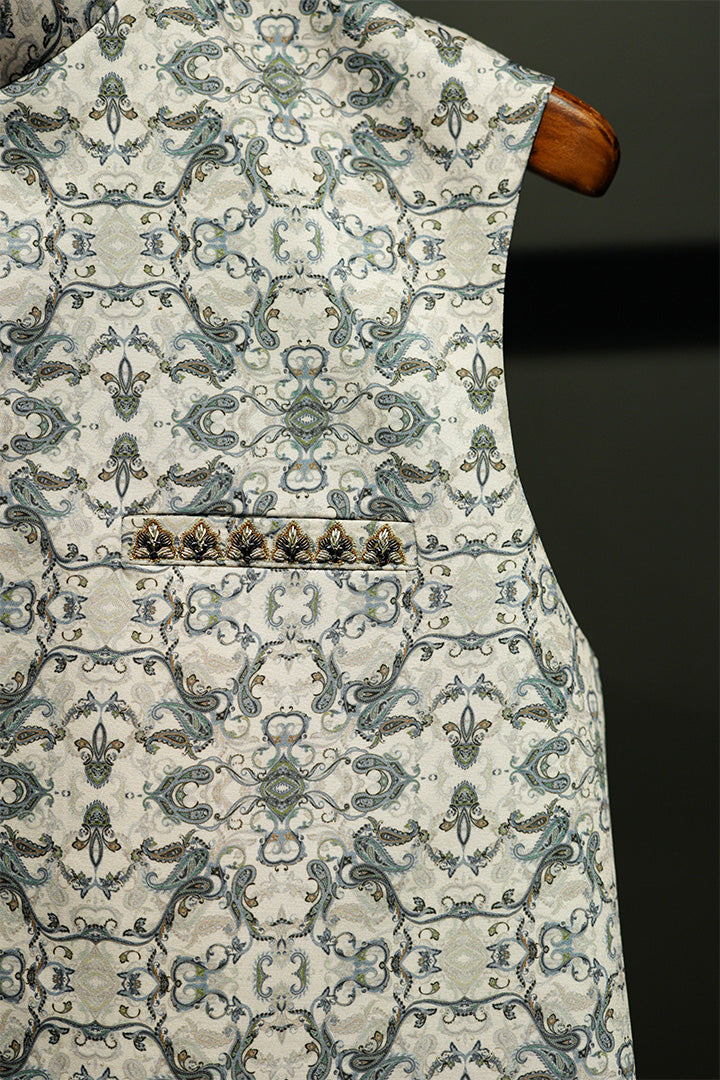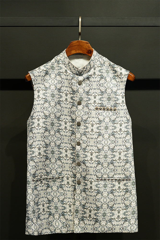 Waistcoat with a refined band collar, adorned with zardozi on the bone pocket for a sophisticated look.
