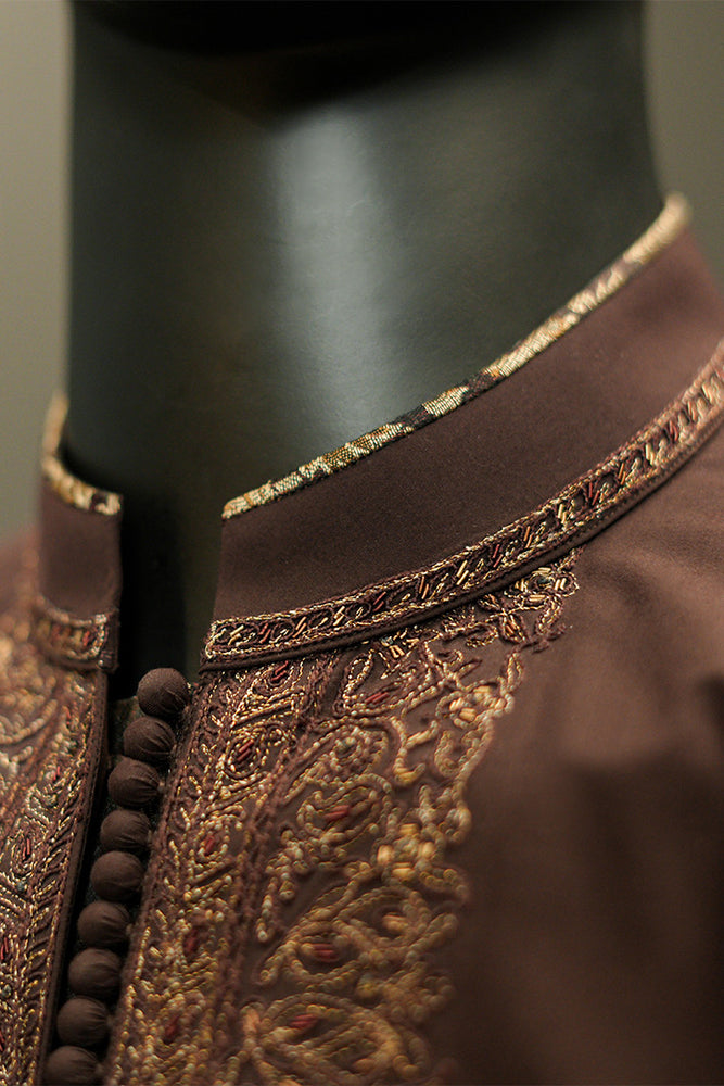 Kurta pant crafted in blended fabric, featuring band collar with embroidery on the front and collar, enhanced with hand embellishments on front.