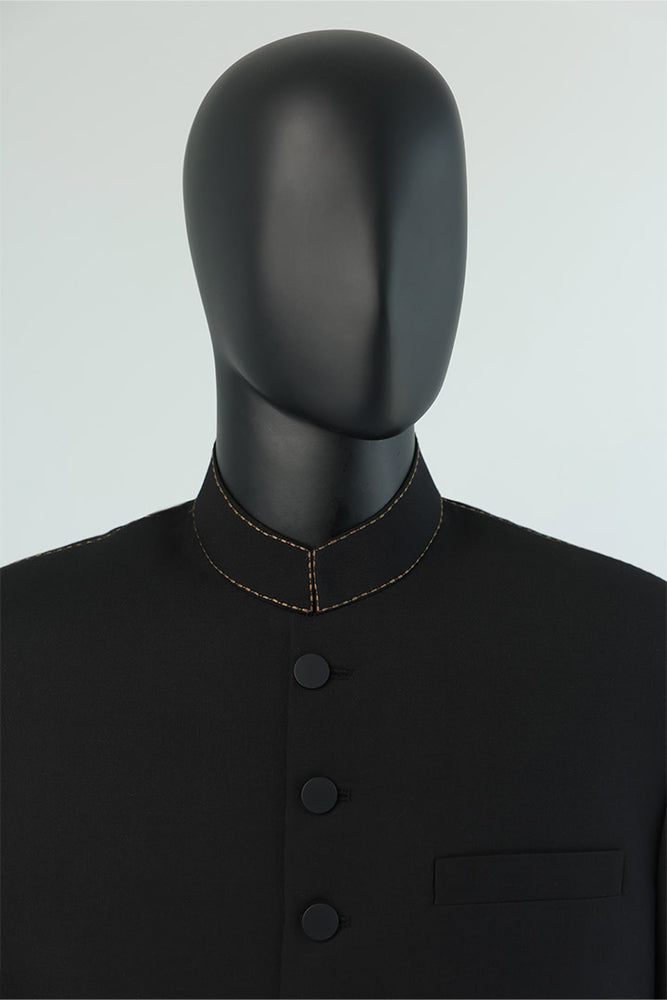 – Classic sherwani collar highlighted with subtle embroidered piping
