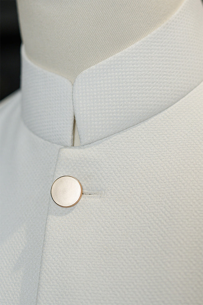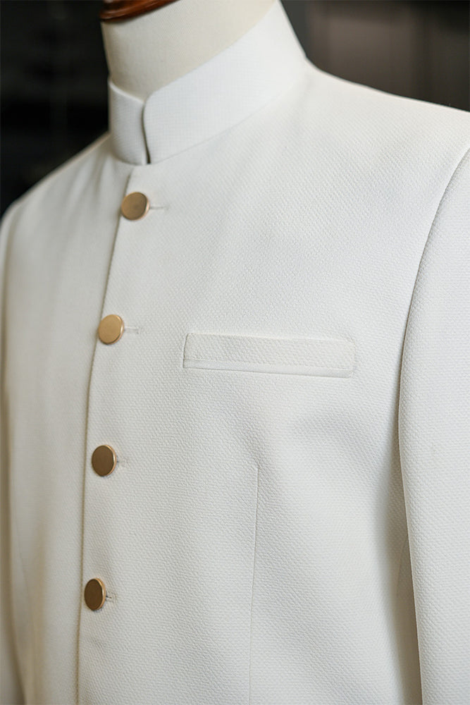 Contemporary 2-piece Prince suit with a sleek band collar, satin-piping welt pocket, and matching tailored pants for a refined look.