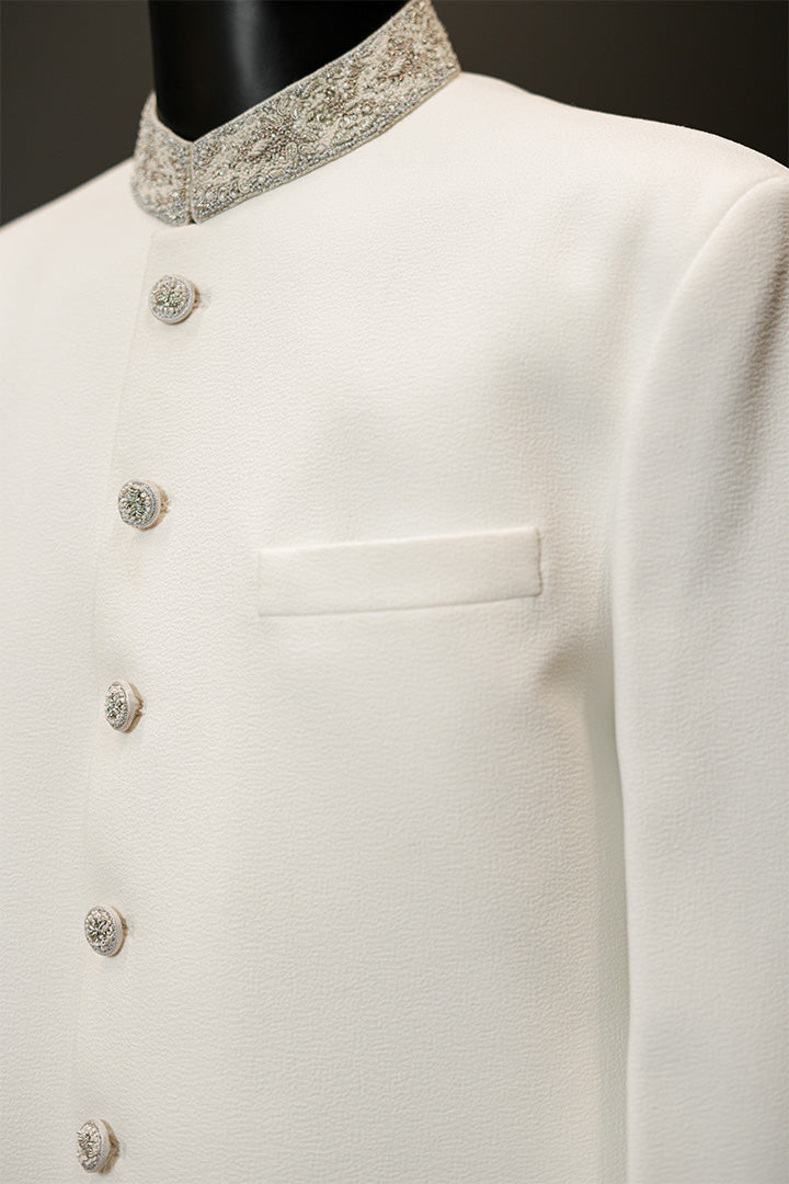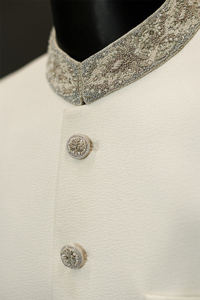 Sherwani collar adorned with zardozi hand-touch detailing, complemented by acrylic embellished buttons for an elegant look.