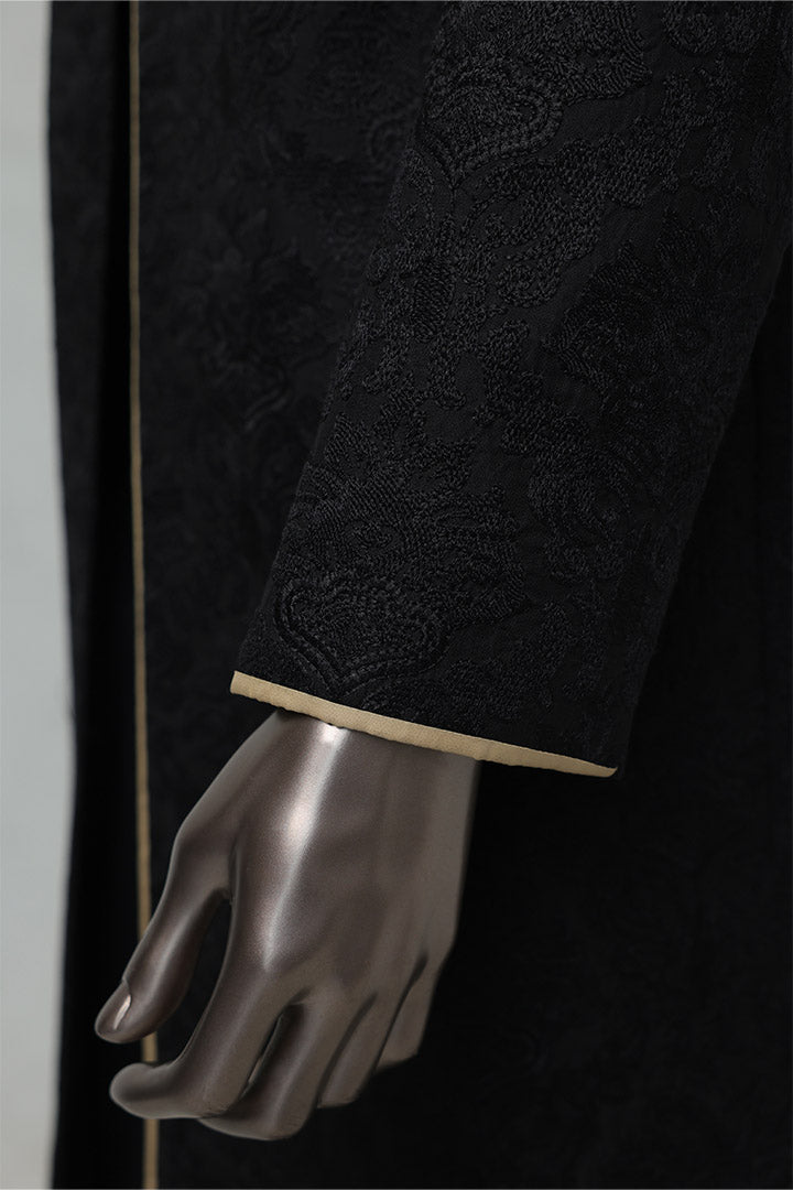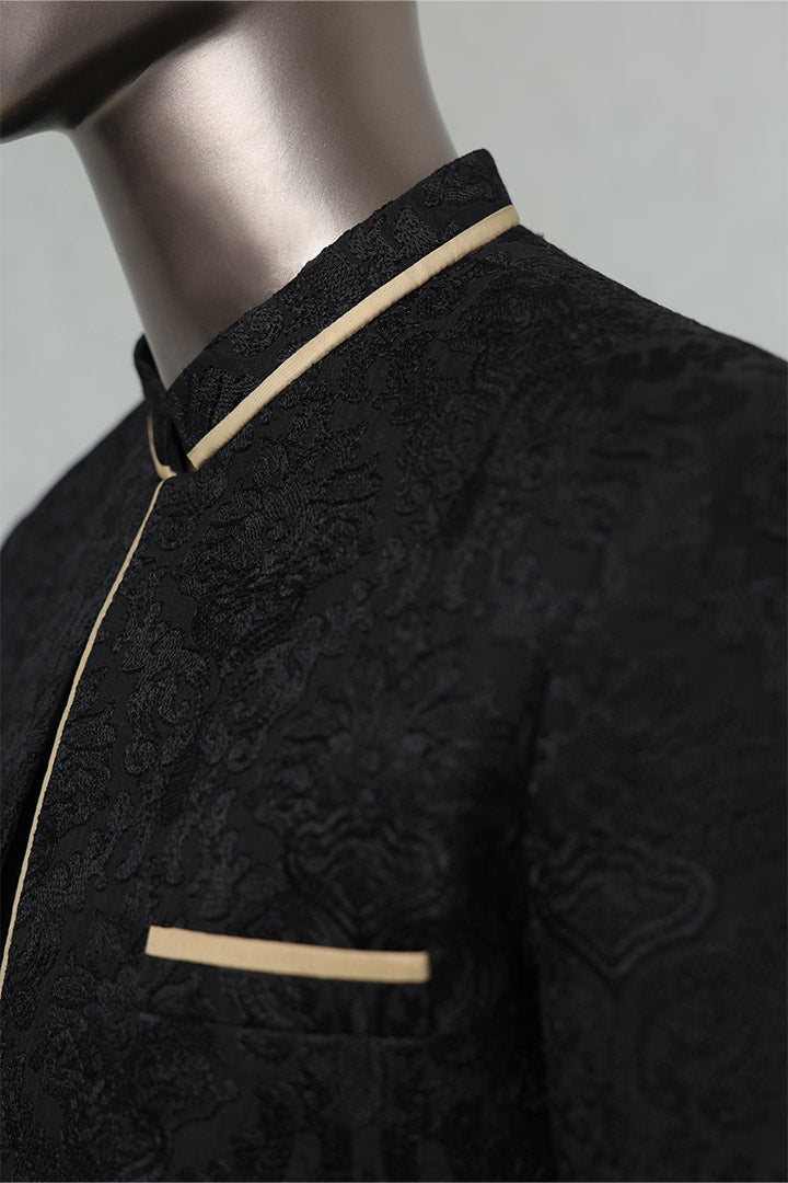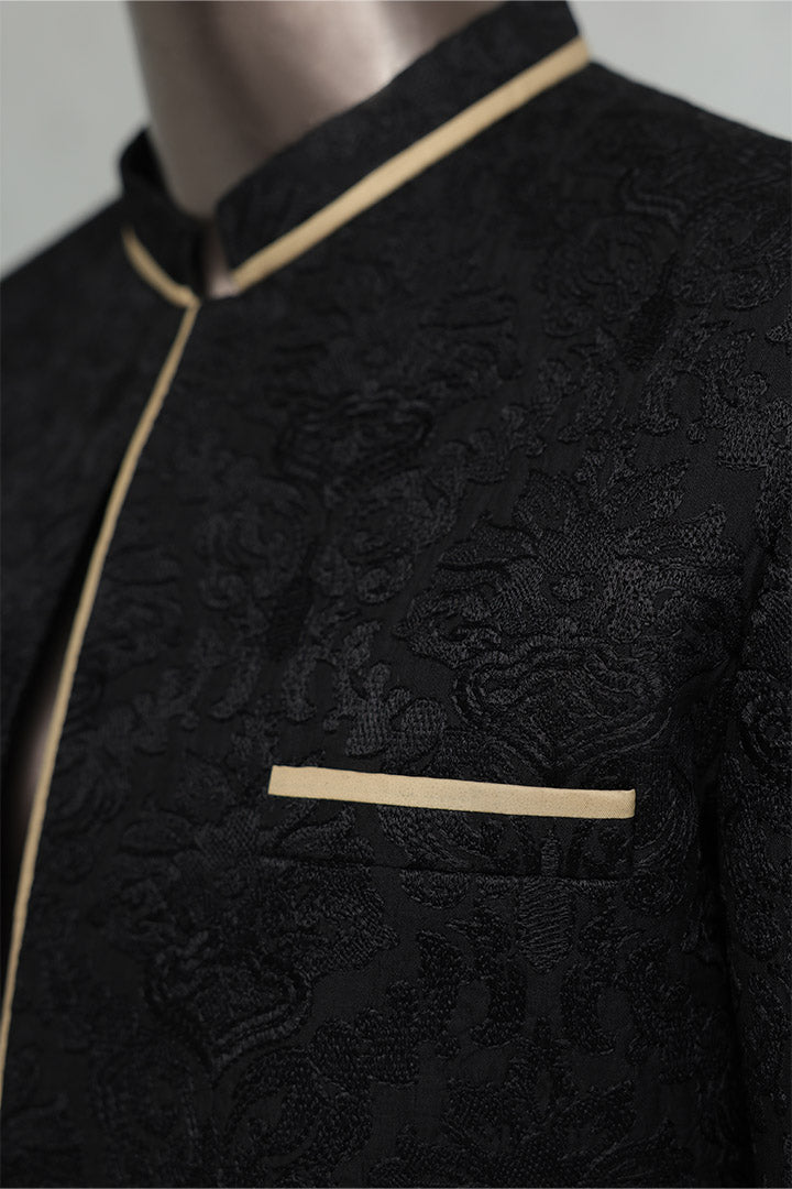 – Full-length straight sleeves with matching gold piping at the cuffs