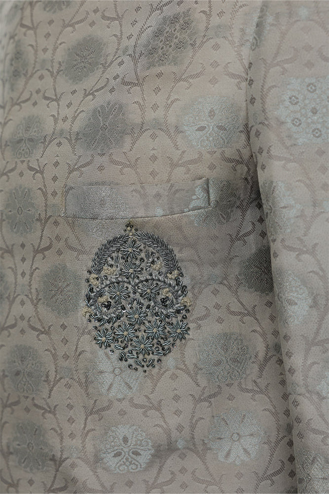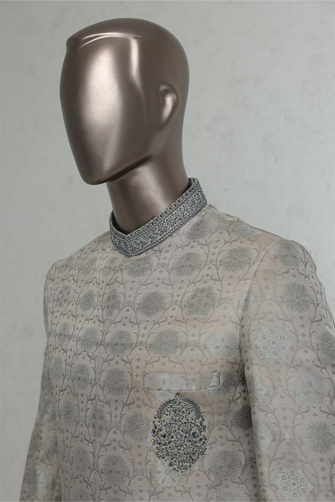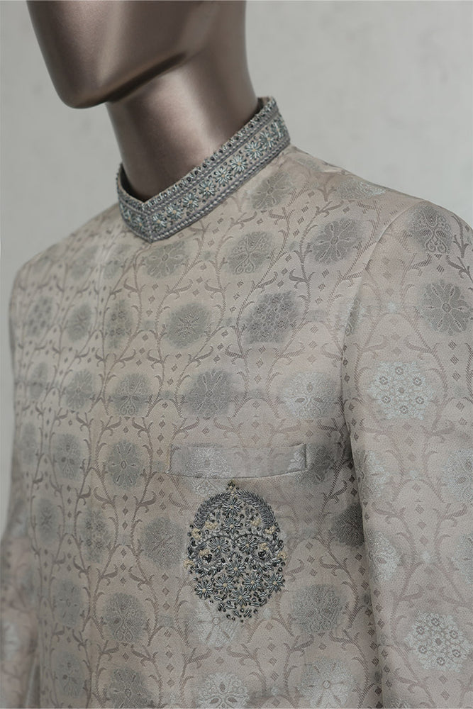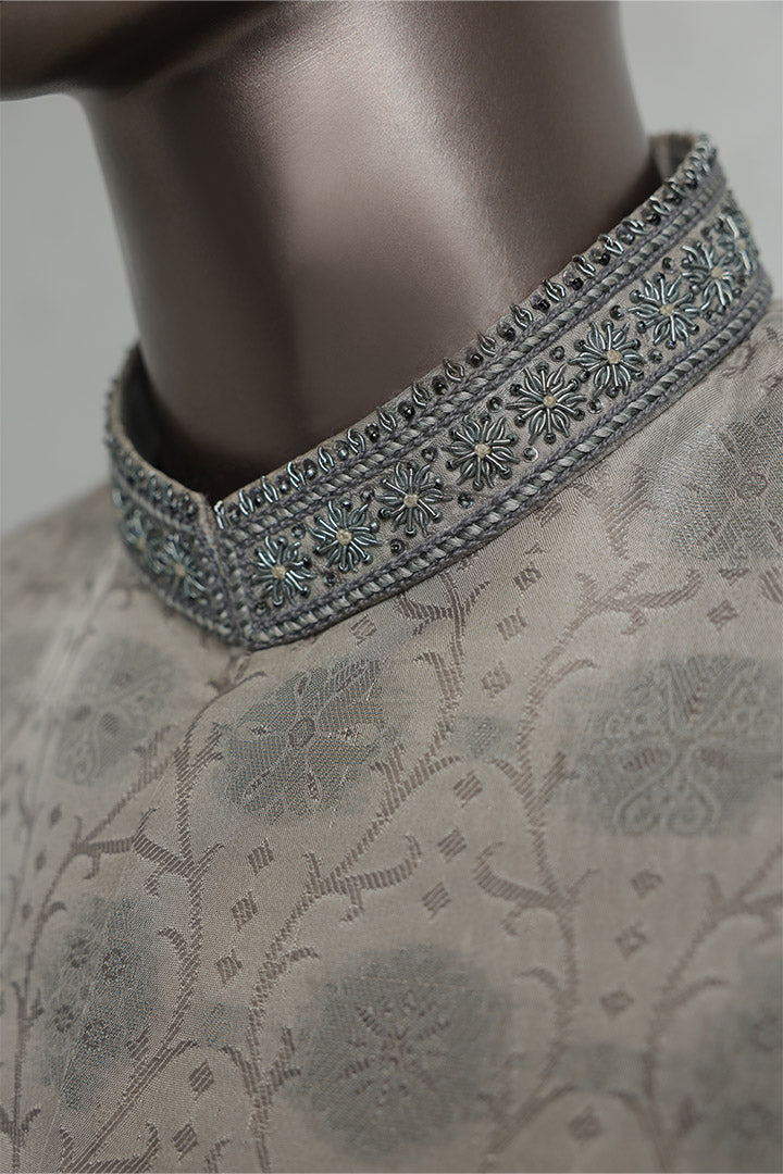 – Hand-embroidered classic sherwani collar with intricate handwork detailing