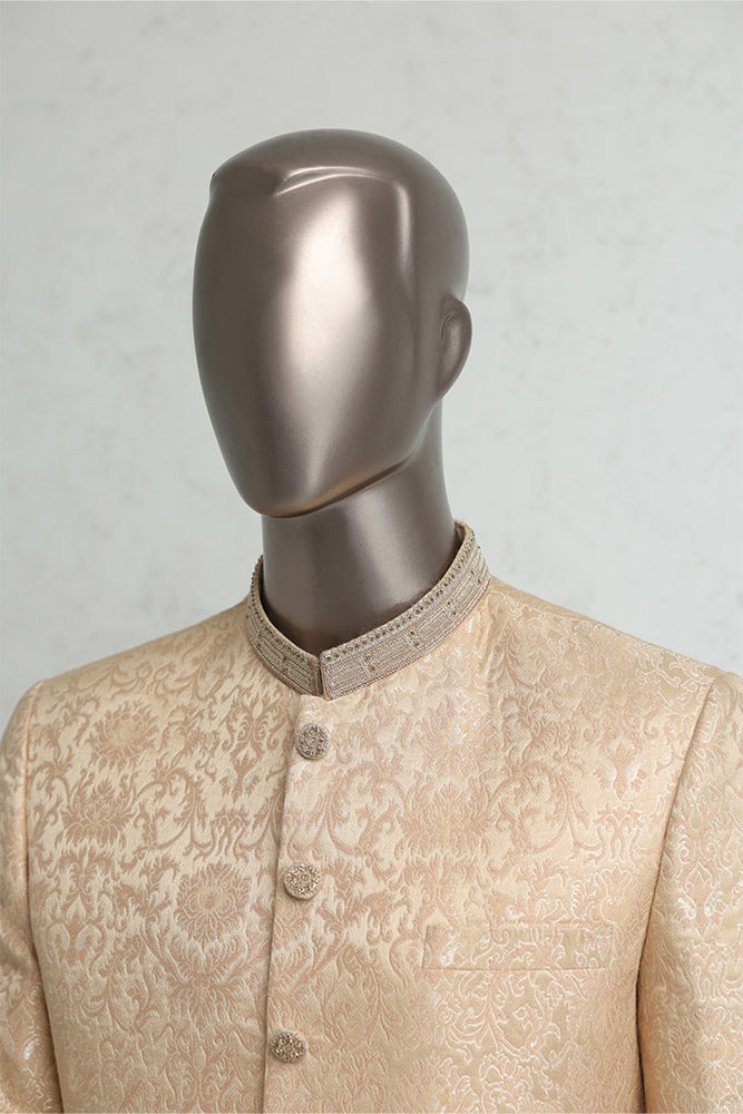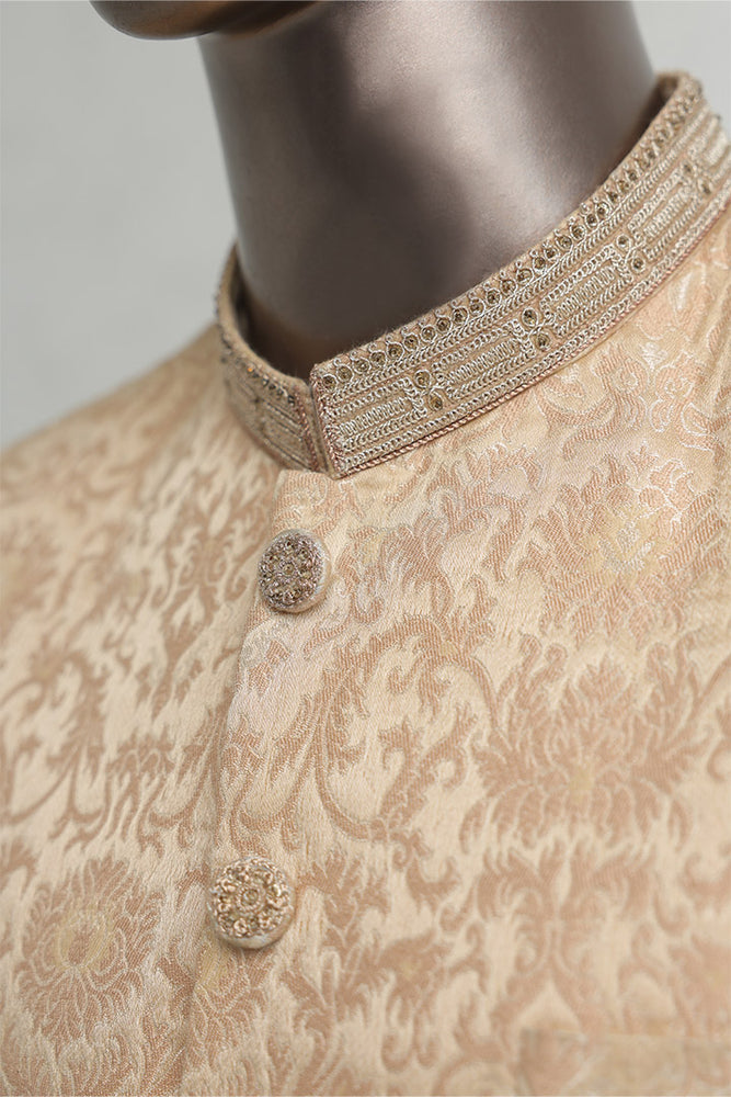– Paired with slim-fit, light beige trousers to complement the sherwani’s warm peach hue