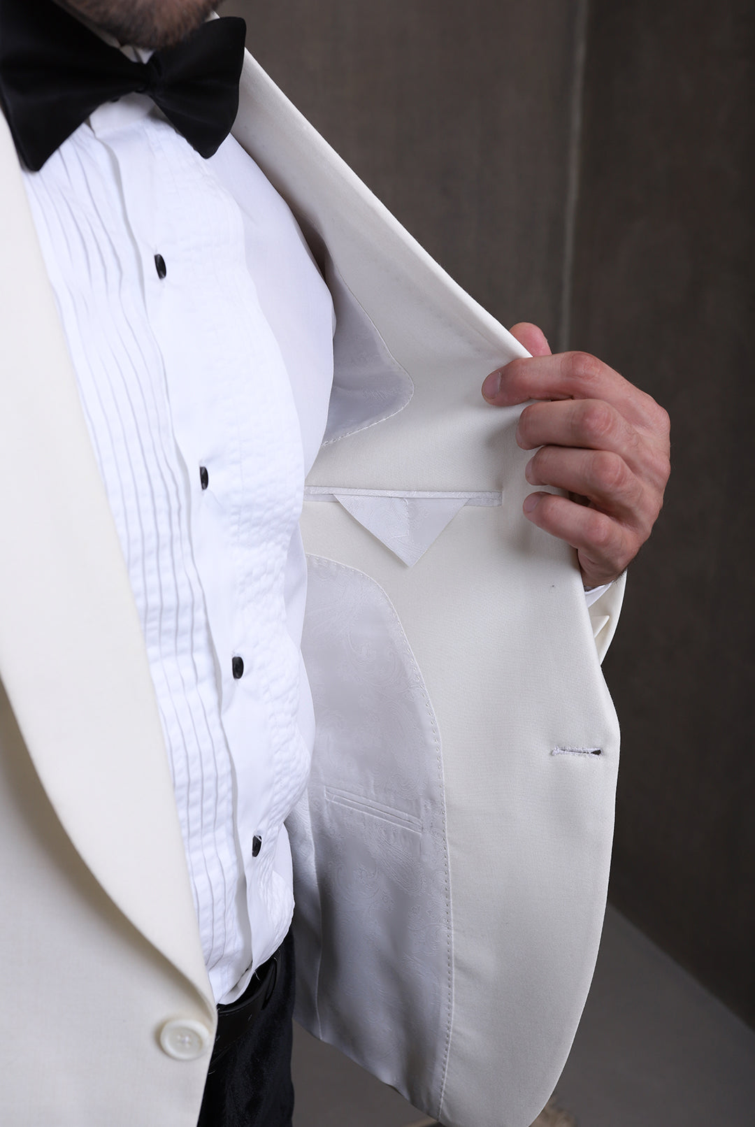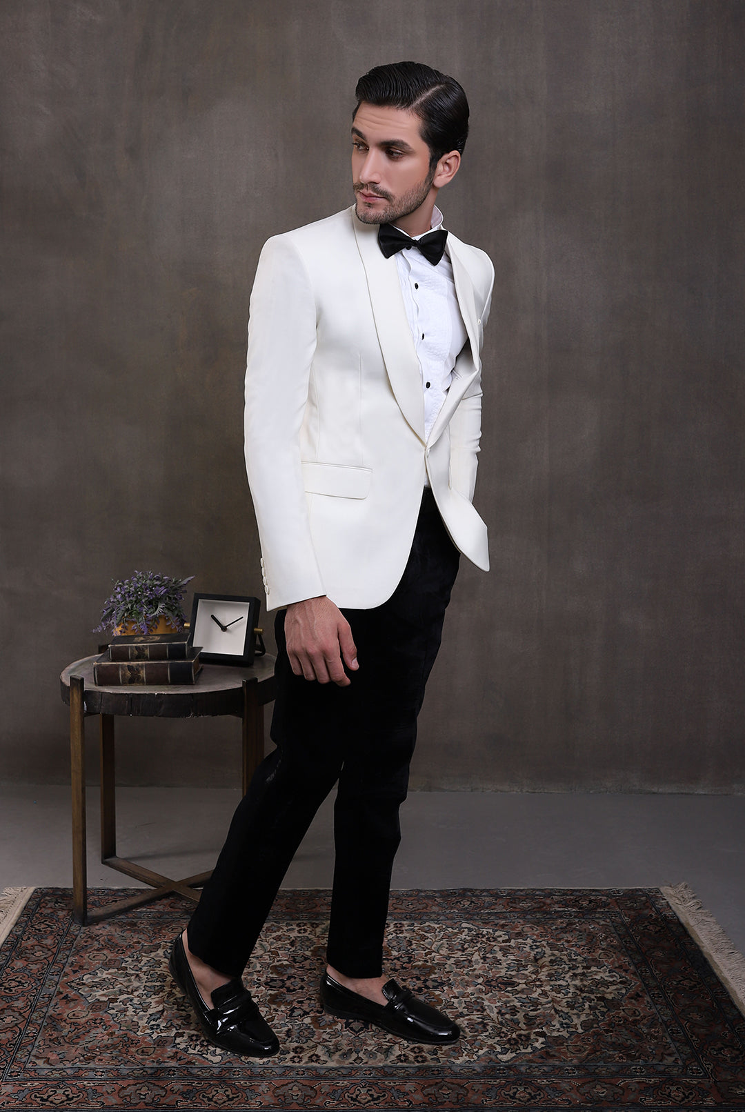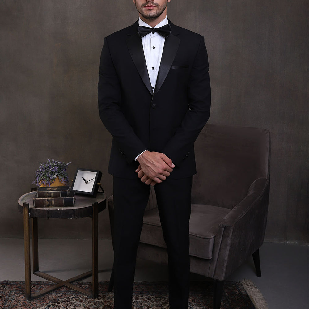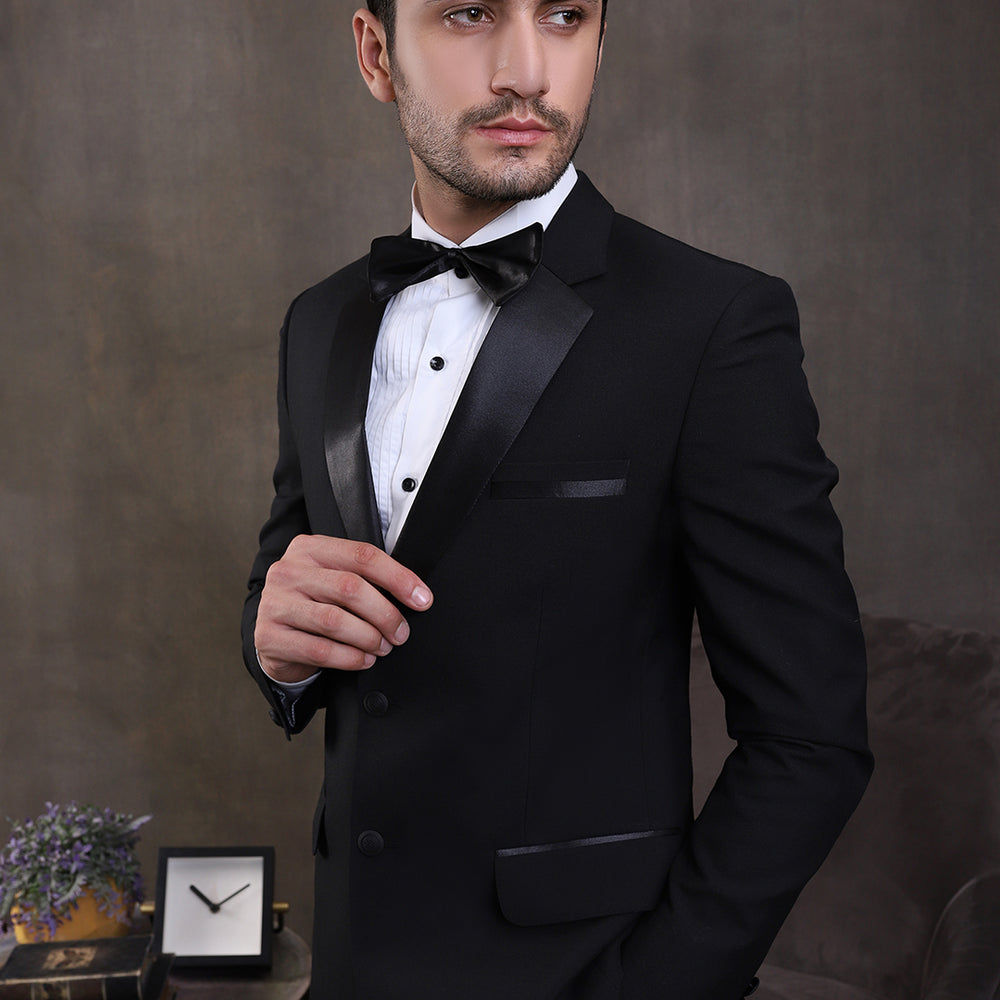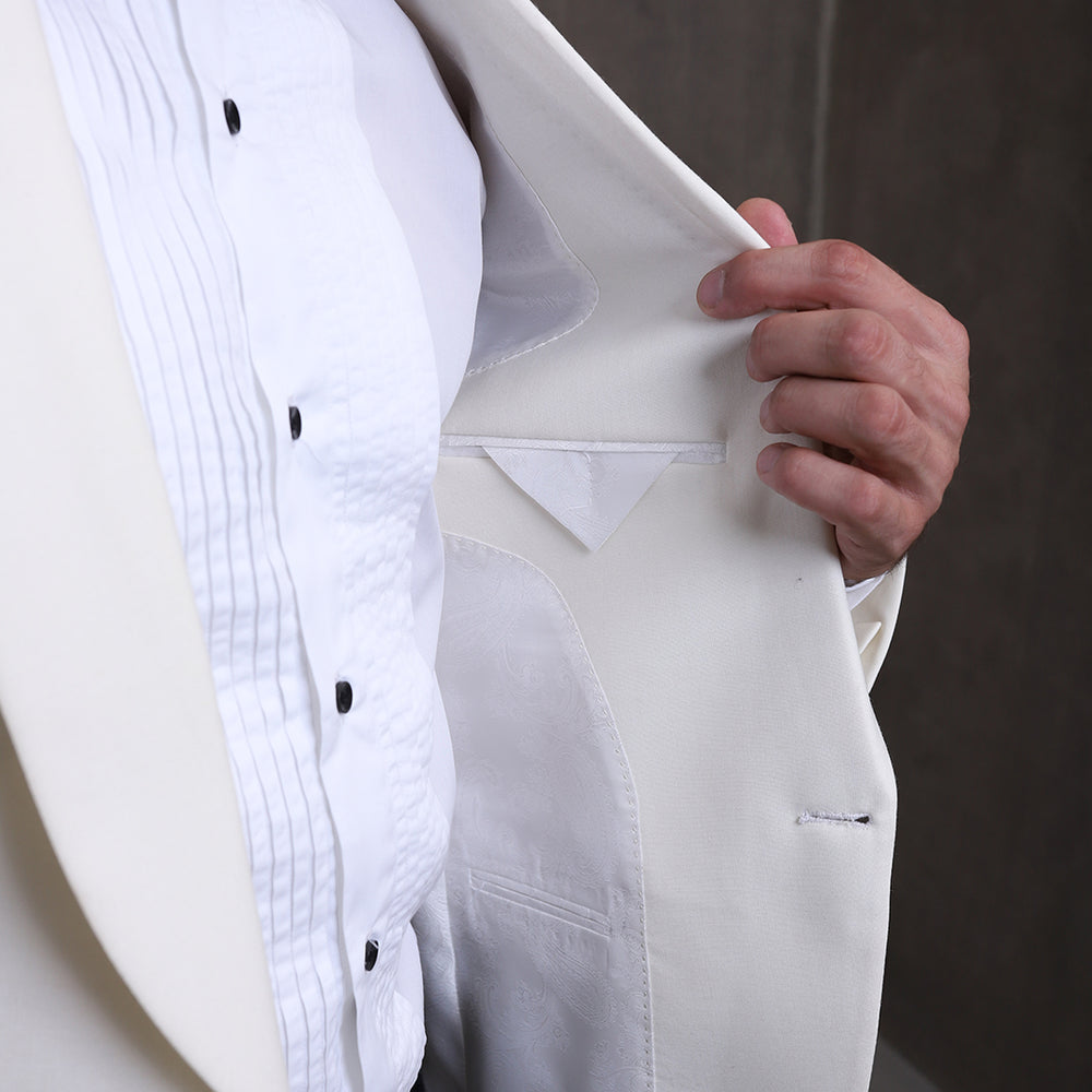 The Premium White 2PC Suit exudes elegance with its white suiting fabric, featuring a shawl lapel collar of the same fabric. It features functional pockets, a single-breasted one-button closure, and a white shirt with front pin tucks and black metal buttons, paired elegantly with contrast pant adorned with a side satin strip for a refined finish.