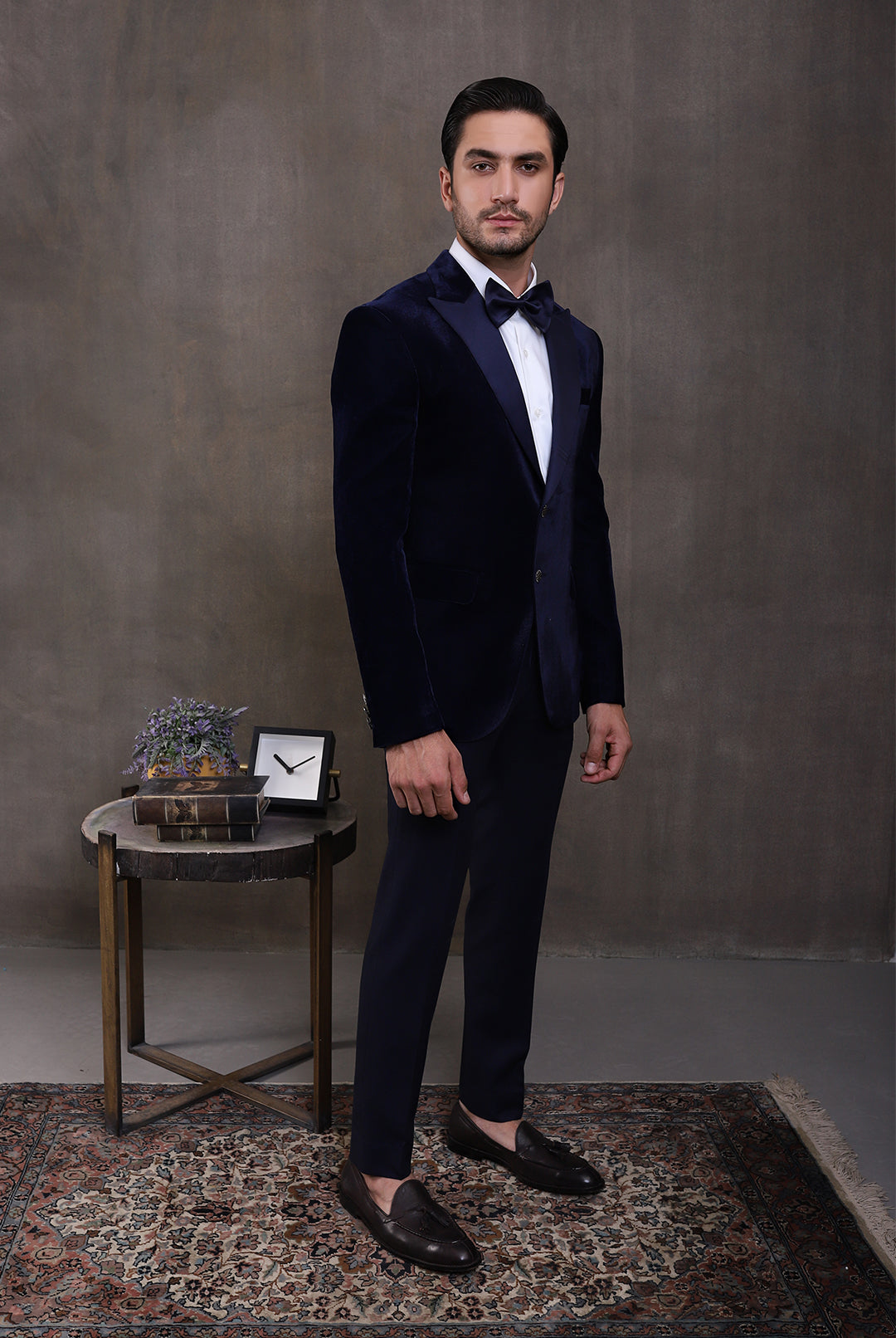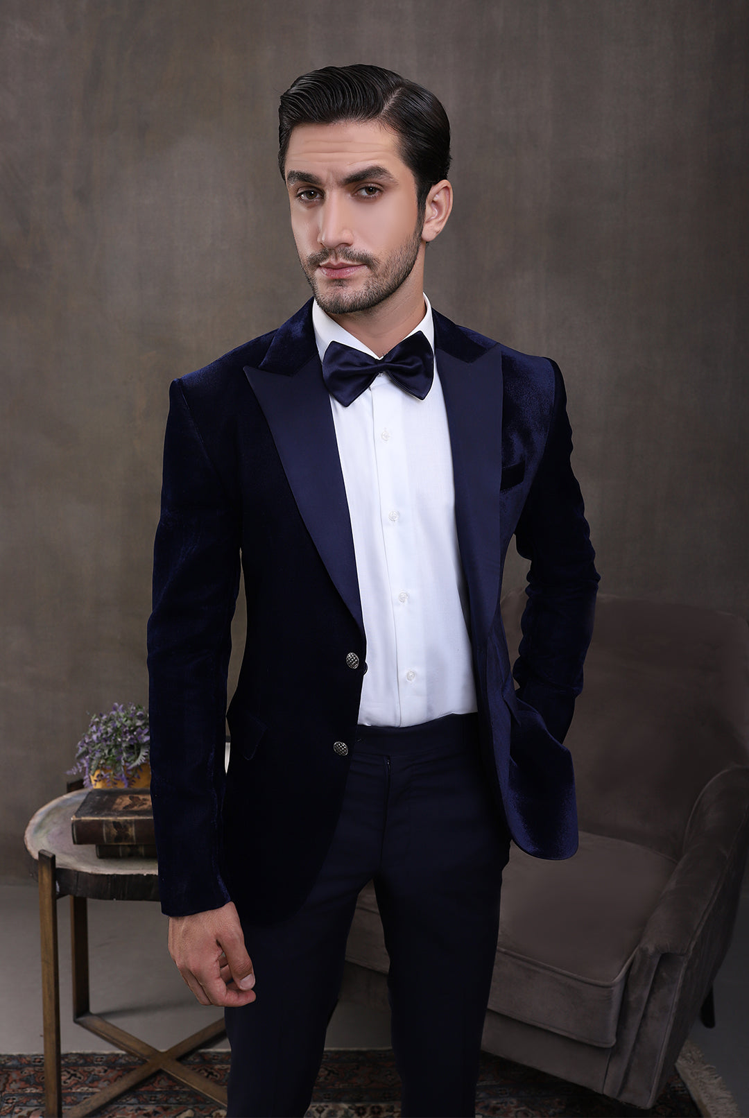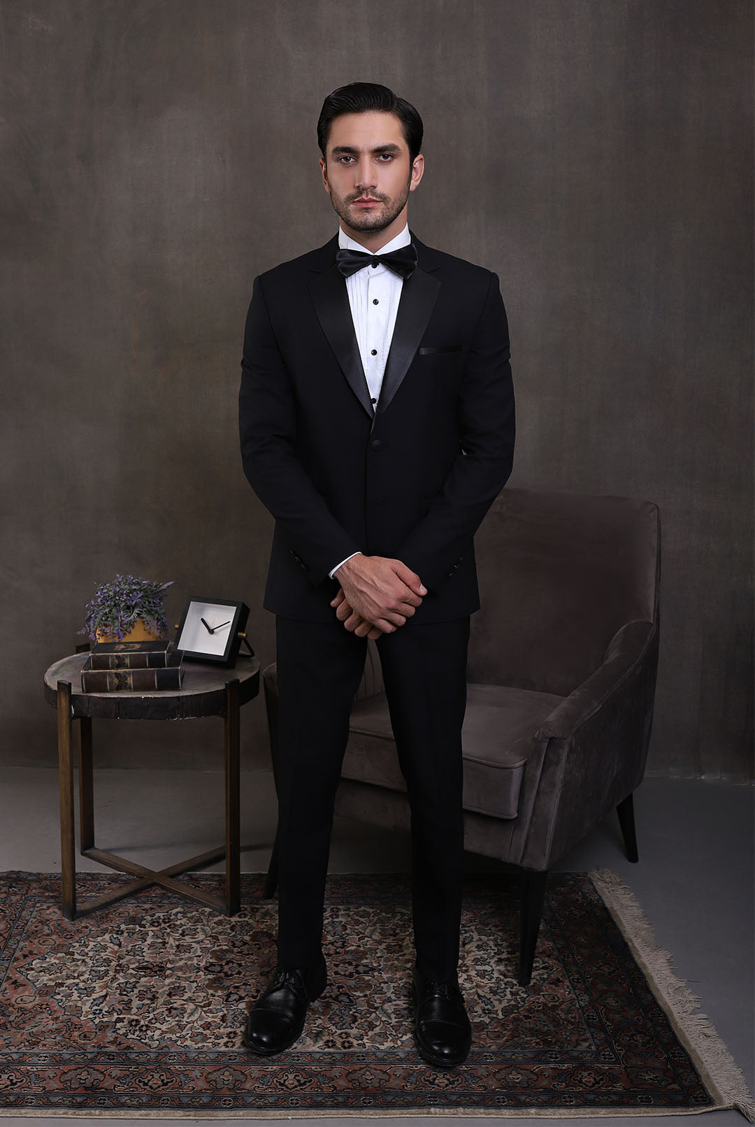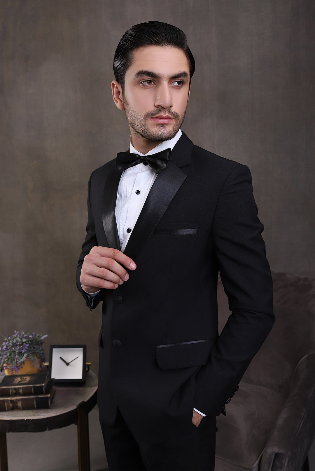 The Premium White 2PC Suit exudes elegance with its white suiting fabric, featuring a shawl lapel collar of the same fabric. It features functional pockets, a single-breasted one-button closure, and a white shirt with front pin tucks and black metal buttons, paired elegantly with contrast pant adorned with a side satin strip for a refined finish.