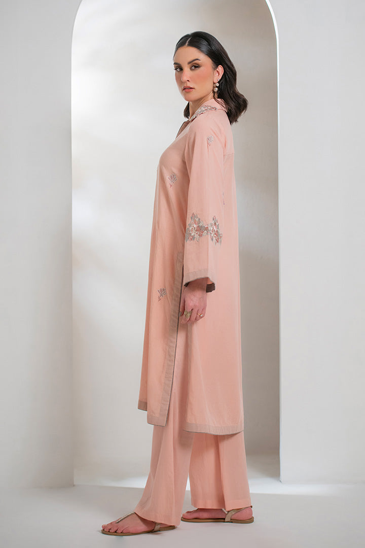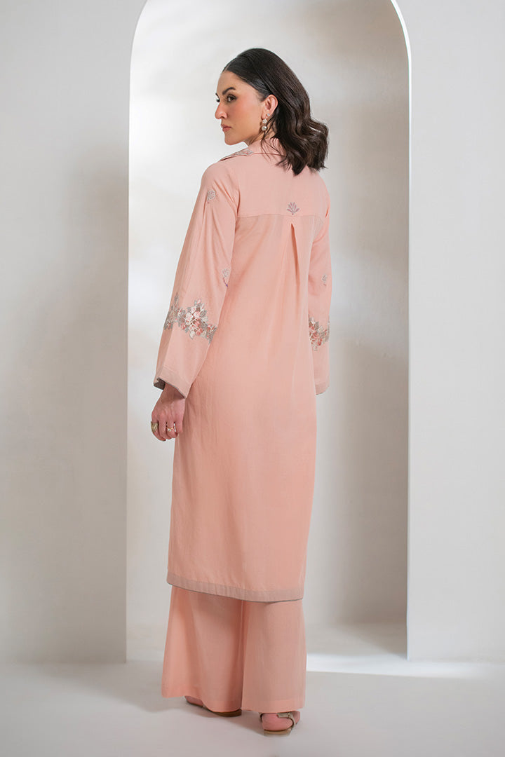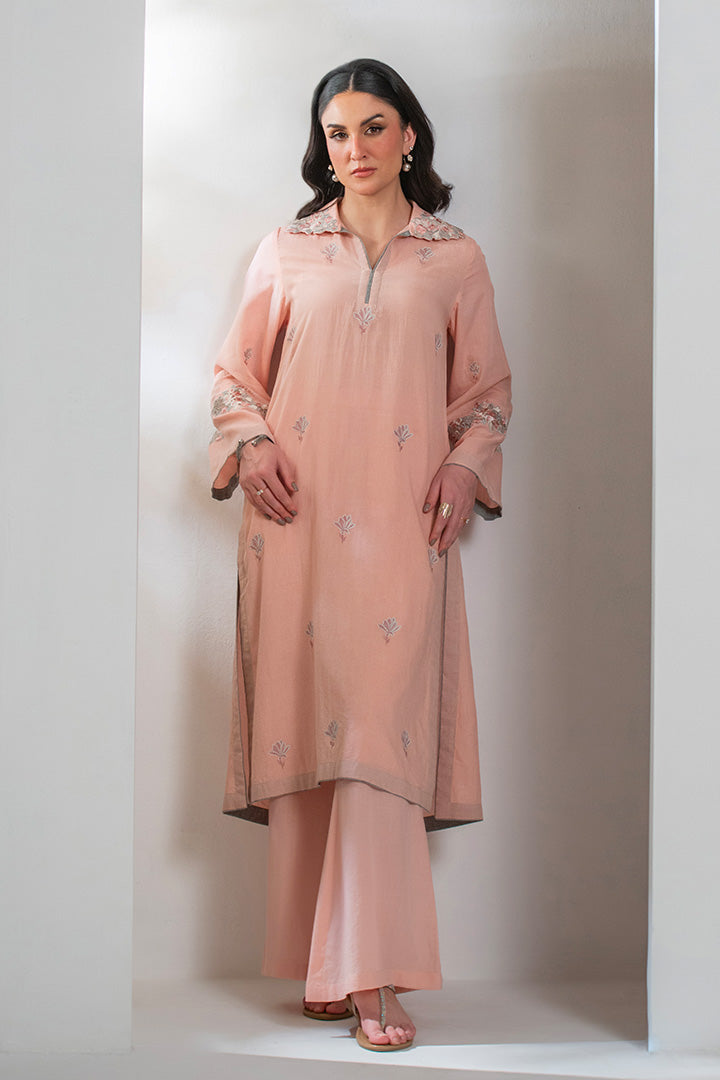 Design Detail: A regular fit medium length shirt with lace collar and embroidered motif all over front. Contrast facing all over, paired with bootcut pants