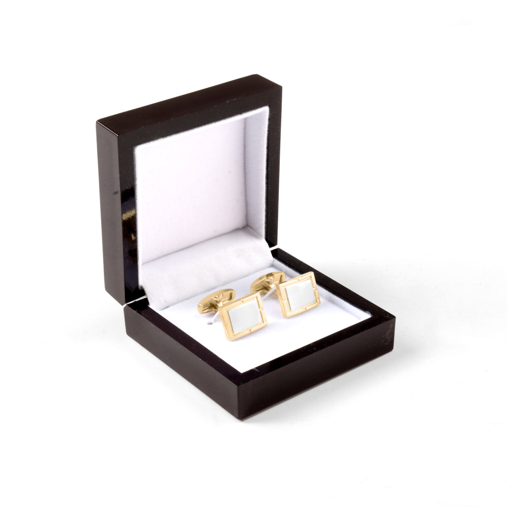 Elegant matt gold cufflinks with intricate silver inlay and edge engravings, perfect for any suit or tuxedo.