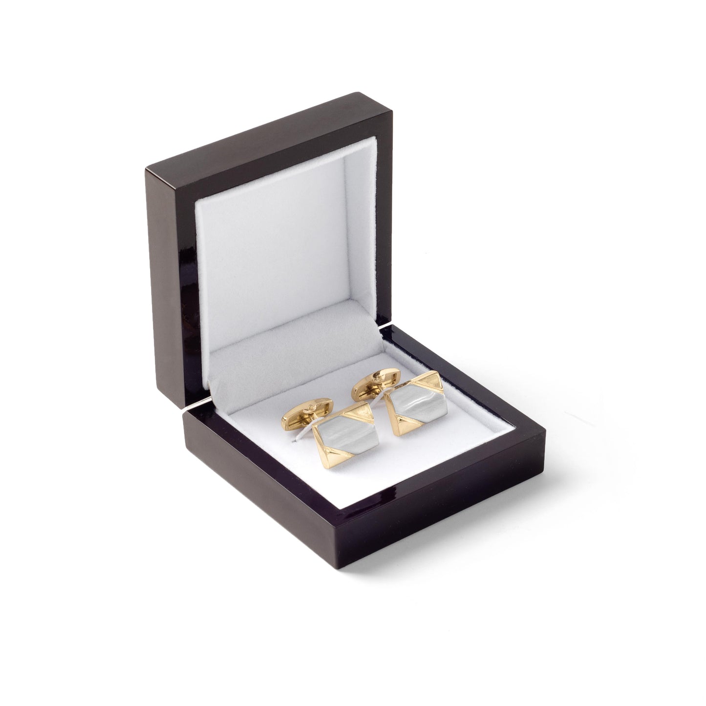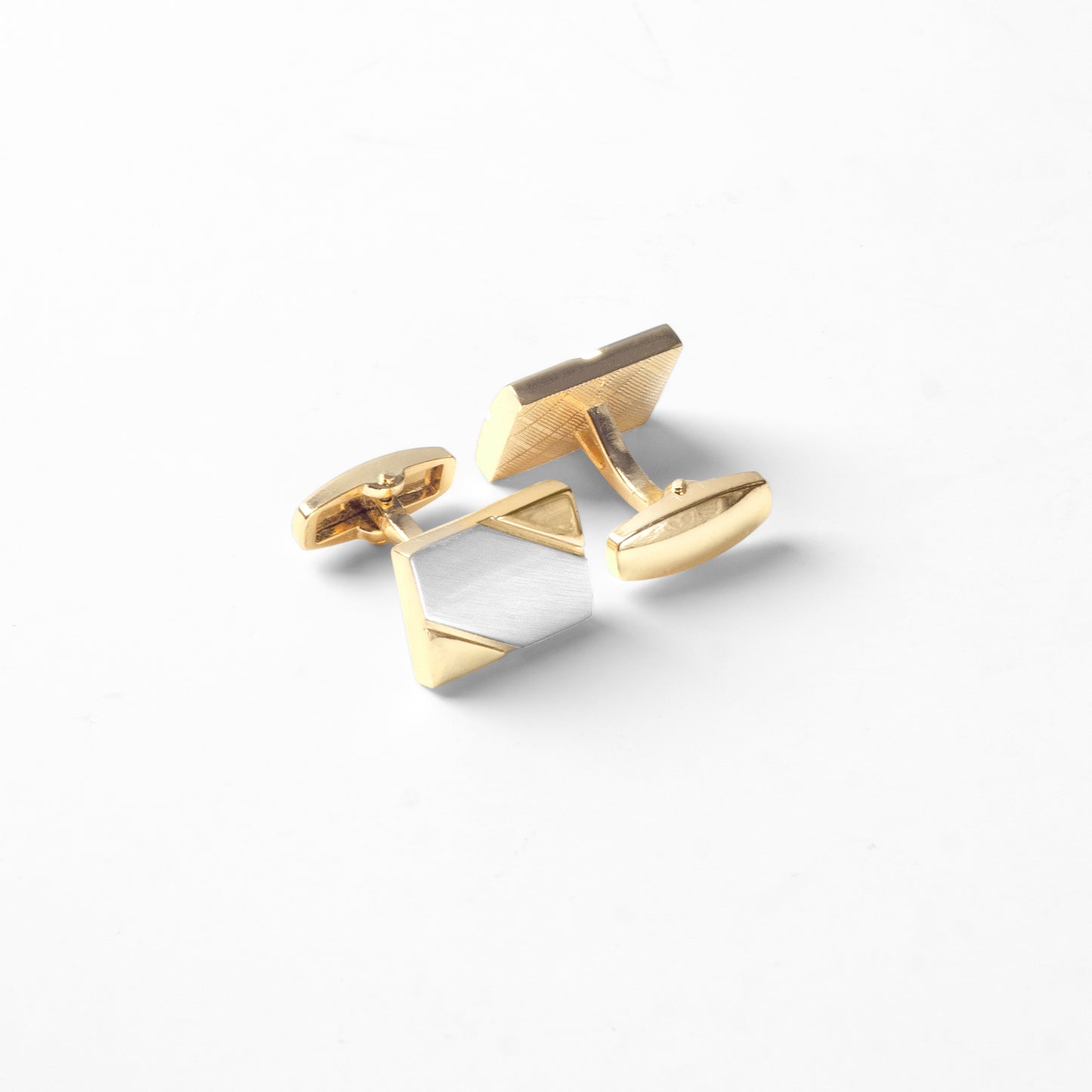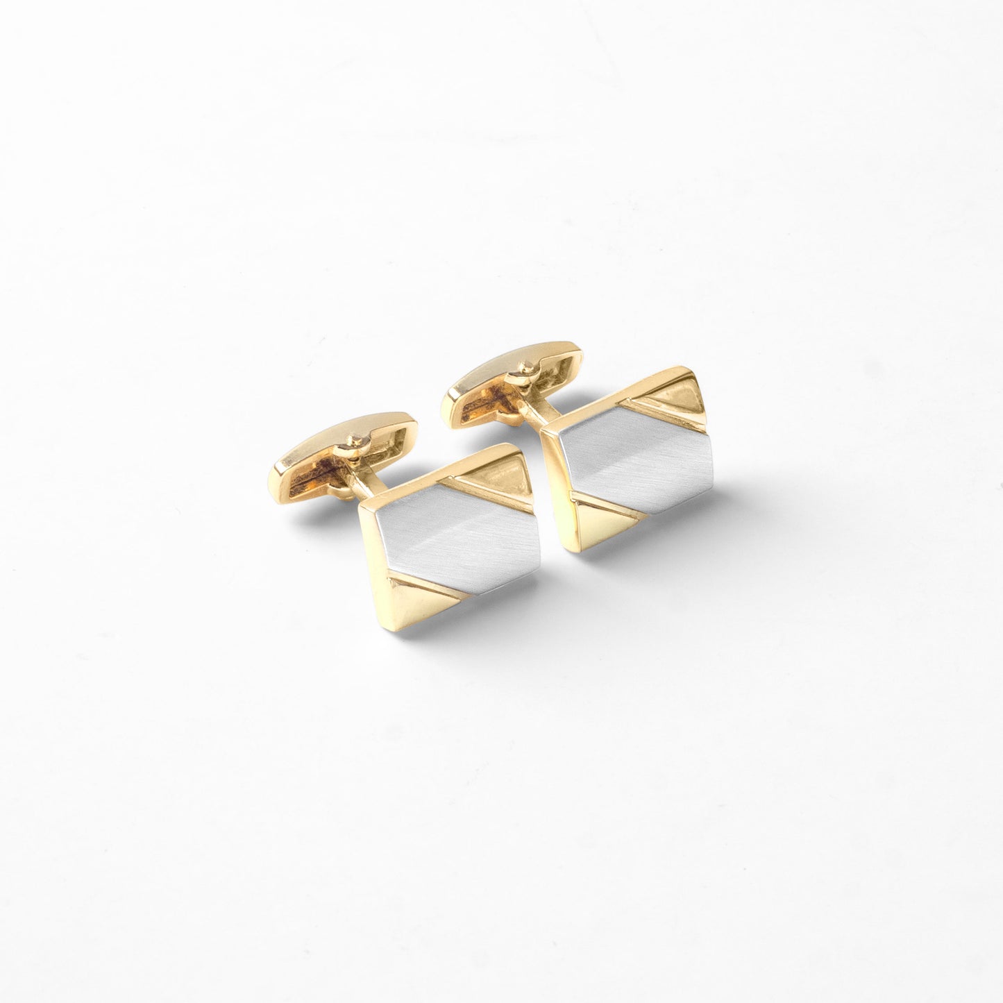 Classic rectangular matt gold and silver cufflinks with intricate stripe engravings on the front and a solid whale back closure.