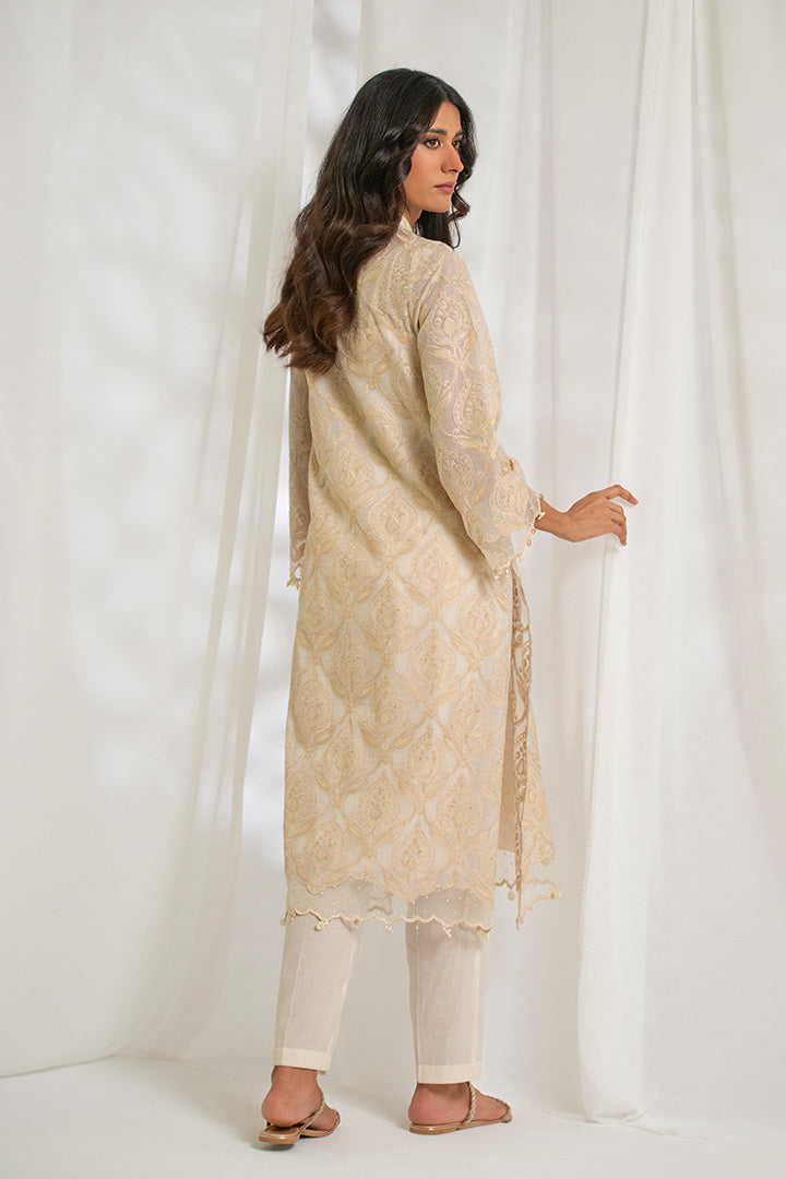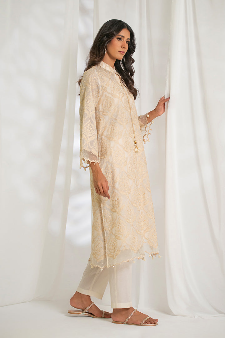 Design Detail: A regular fit long length shirt (cotton silk inner included) with highneck collar and pearl drawstring tassels. Embellished