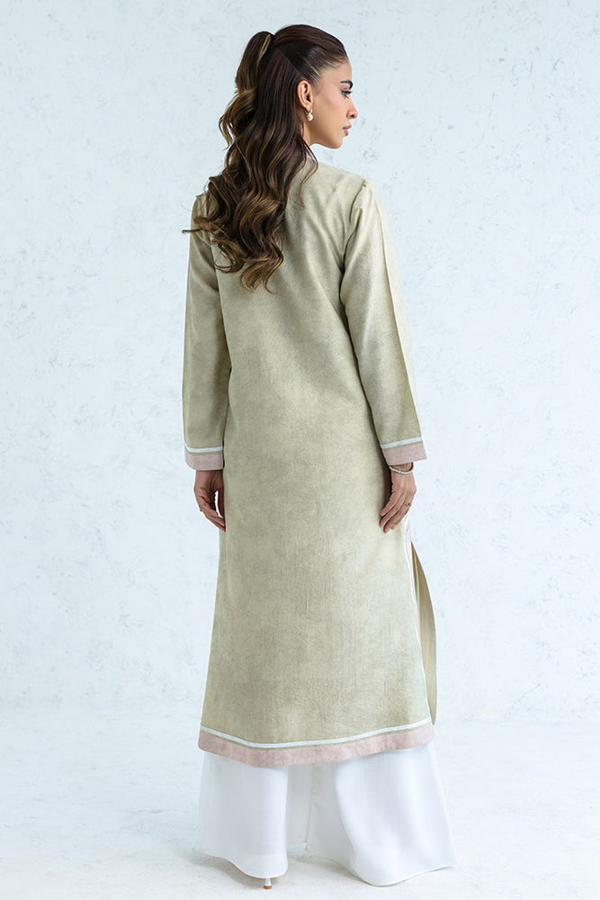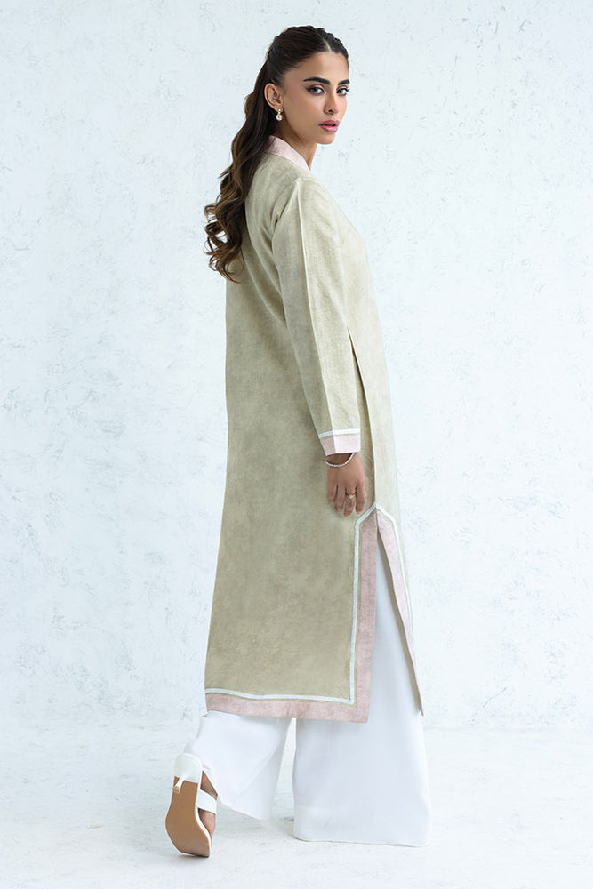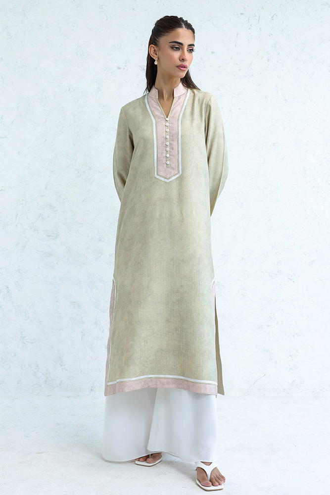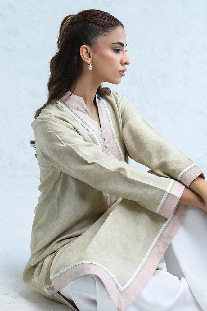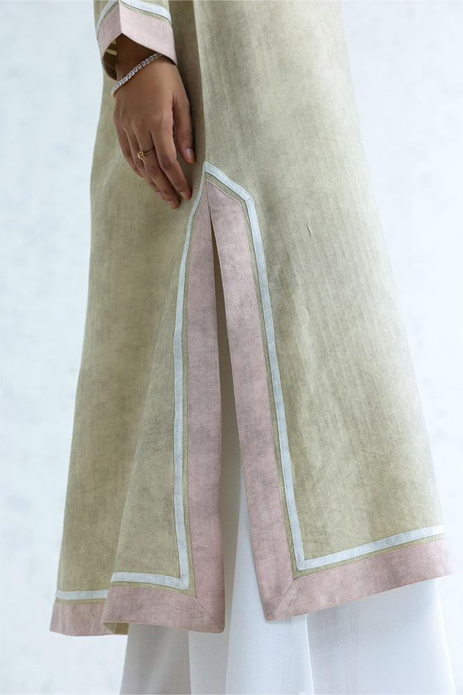 Design Details:Central placket area, sleeves, hem line and the short side slits are highlighted with a contrasting peach and beige fabric.