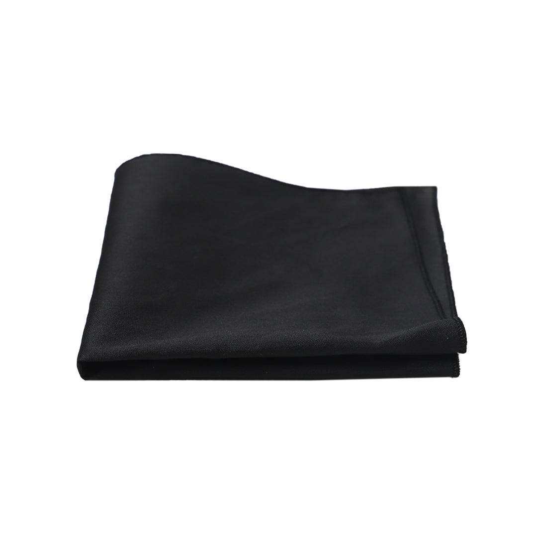 A luxurious silk pocket square in classic black with a smooth texture that effortlessly elevates any suit, ensuring a sophisticated look for any occasion.