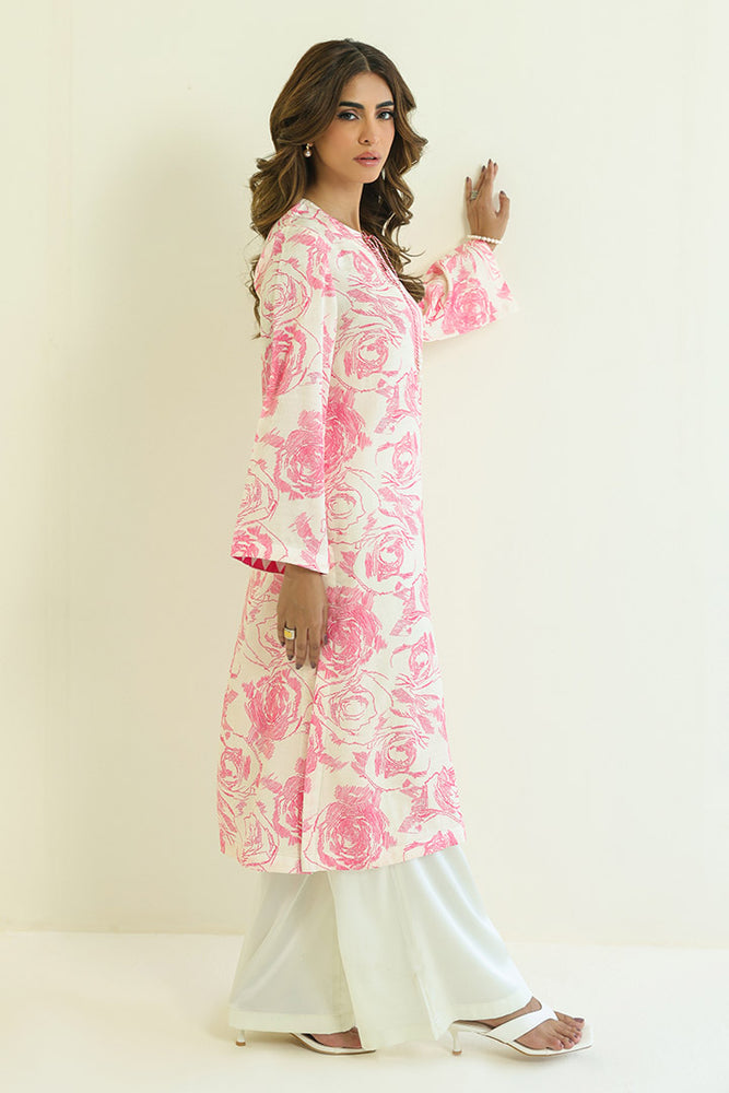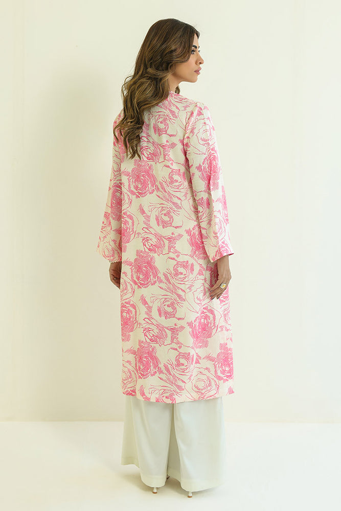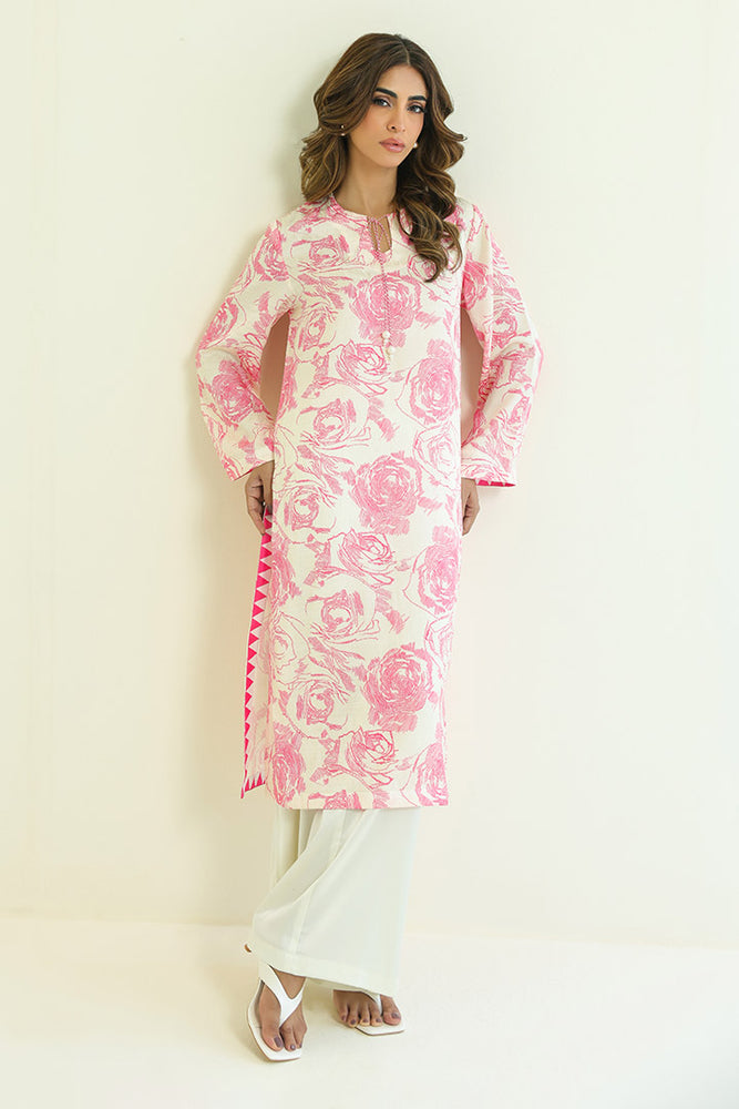 Design Details: triangular digital fabric facing on sleeve, hemline and side slit for added design.