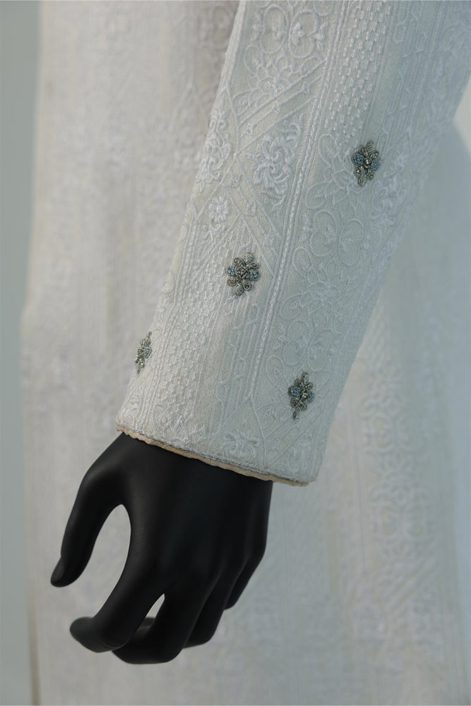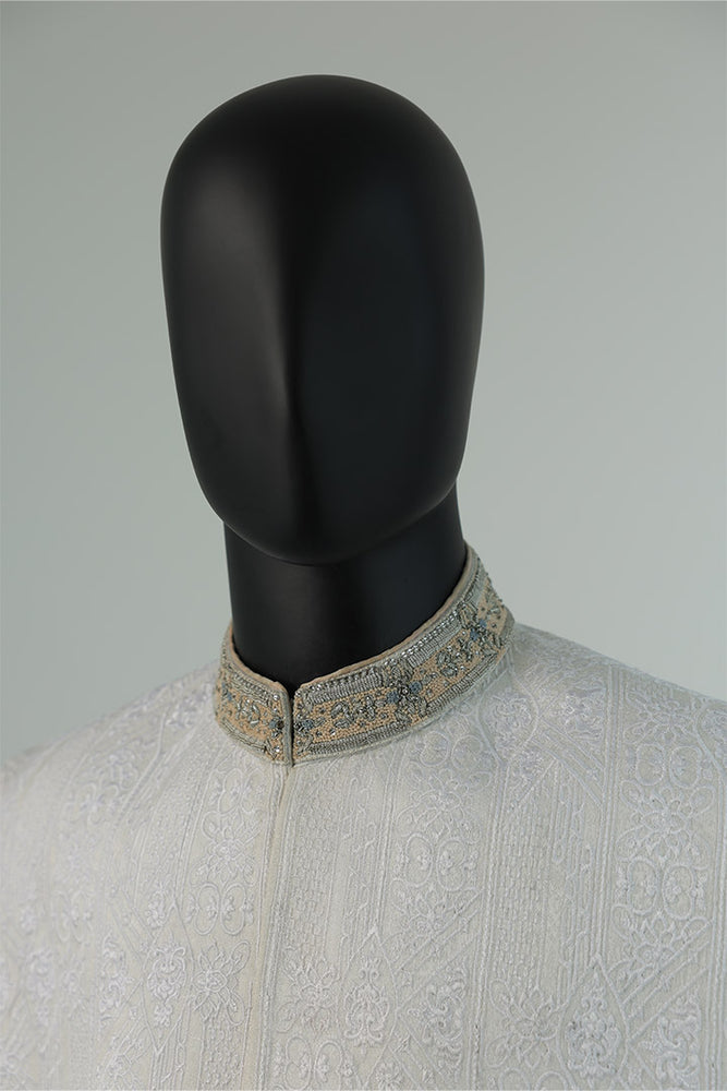 – Classic sherwani collar adorned with intricate embroidery and delicate gold piping